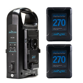 Included in this kit, Two IndiPRO Tools 270Wh Micro-Series V-Mount Li-Ion Battery and a Dual V-Mount Battery Charger. The battery's 18.6Ah capacity and 14.8V output are sufficient to power most professional cameras. The Dual Charger can charge up to two V-Mount batteries simultaneously.