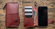 Pack your essentials along with your iPhone 14 Pro Max OR 15 Pro Max into this deluxe wallet! The silicon bumper makes it a cinch to pop your phone in and out and it's handcrafted in full grain Bridle leather. Enjoy 8 card slots, one cash pocket and 2 quick access exterior credit slots and a swivel clip to attach your wallet chain or keys. Inside the wallet are 6 RFID blocking card slots and a larger interior pocket. Conveniently tote your iPhone, cards, ID, business cards and receipts!