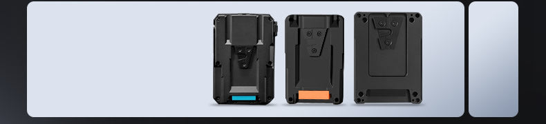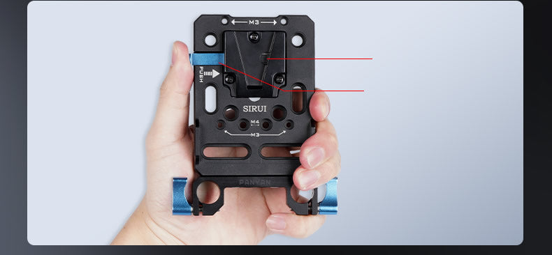 Align the battery with the V mount at the back and install it from top to down.Push the blue button to quickly detach battery.